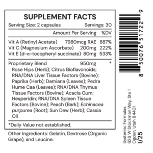 High potency, broad-spectrum detoxifier; an excellent drainage formula for use in any cleansing, elimination program, and/or detoxification program, especially for organ detoxification. In addition, support is provided for the liver, especially the left lobe, and the kidneys. Helps avoid cleansing reactions (Herxheimer’s).